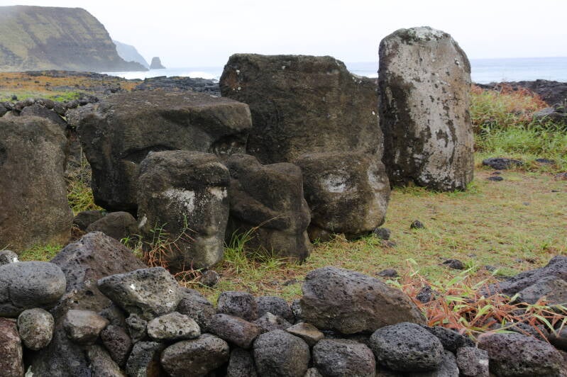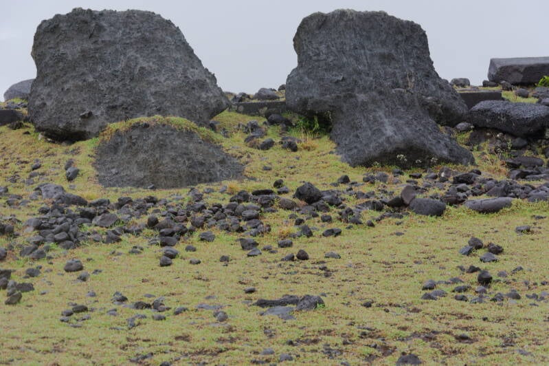 Des pétroglyphes sont le bas arrière de certains Moaï , peut être visibles sur celui de droite.