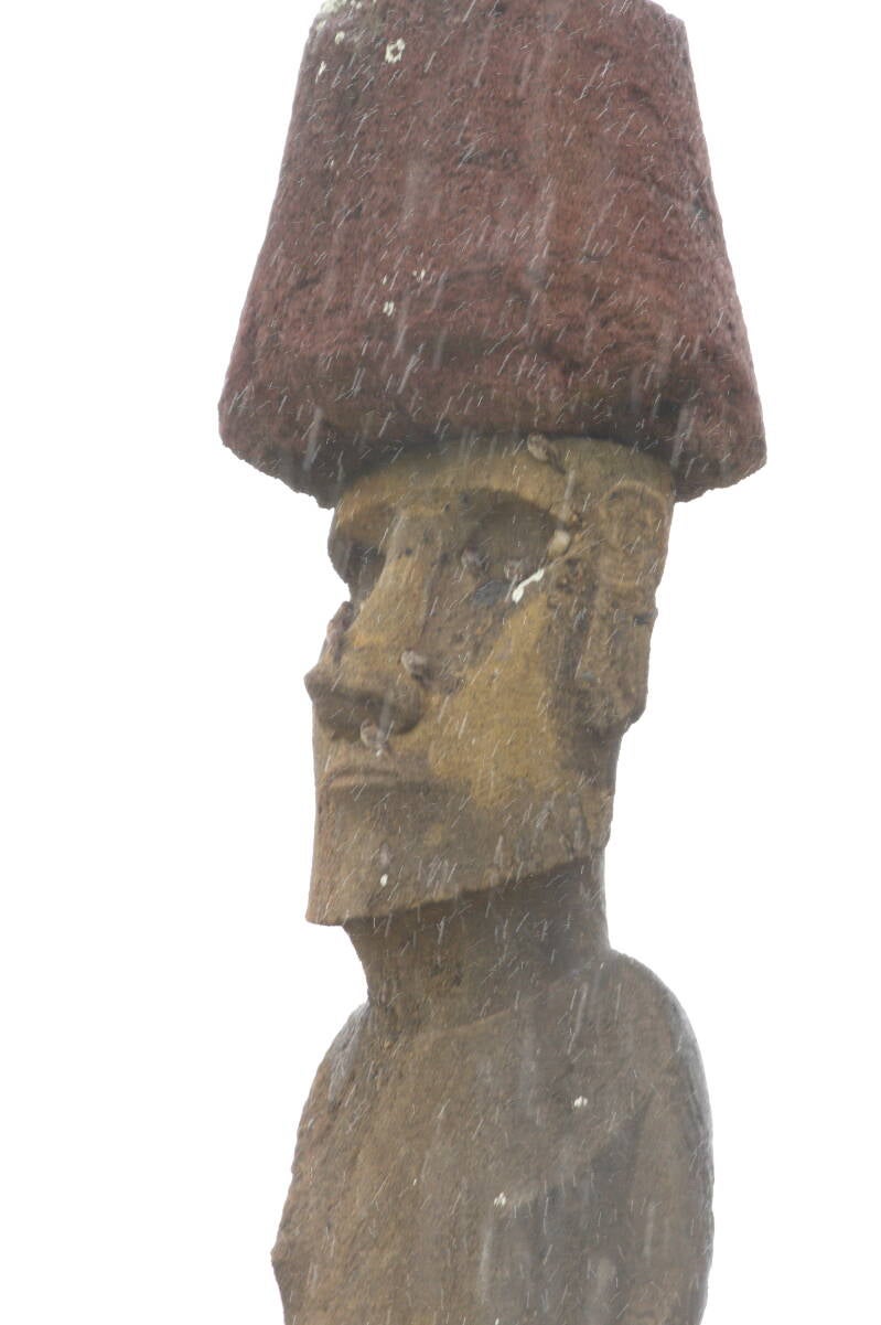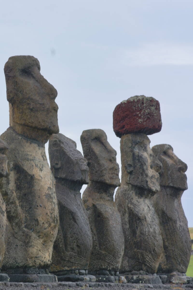 Quelques moaï ont conservé leur ‘’coiffe ’’ appelée pukao. Ces pukao sont sculptés à partir d’une roche volcanique rouge (tuf) qui ne se trouve qu’à Puna Pau ( petit cône volcanique de l’île) à 5h à l'intérieur des terres sur la carte.