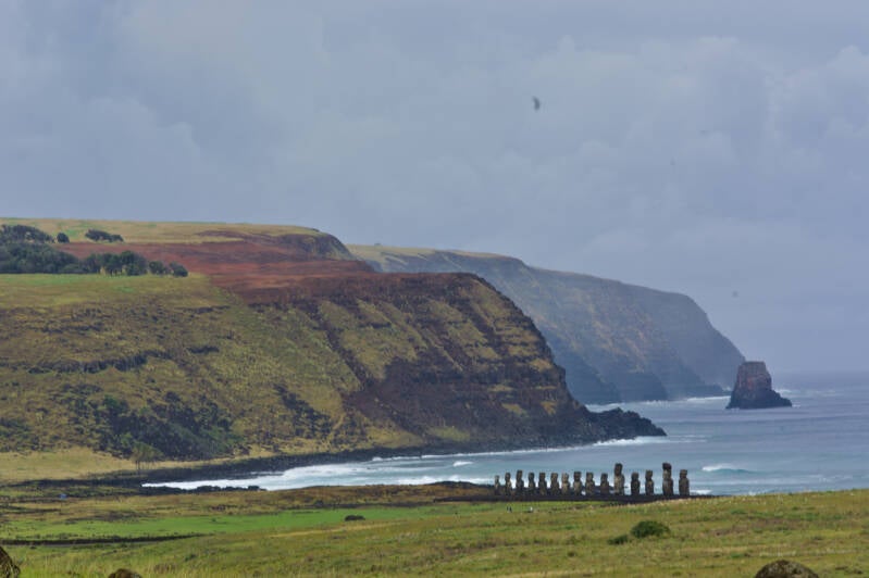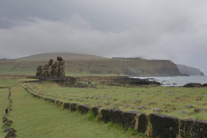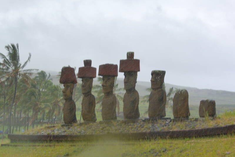 Le complexe cérémonial(ou niel) de Tahai, (Ahu) à l'Ouest, ( à 8h sur la carte) un jour de pluie.Un ahu est un site cérémoniel, 'une plateforme en pierres, généralement surmontée de grandes statues dénommées moaï