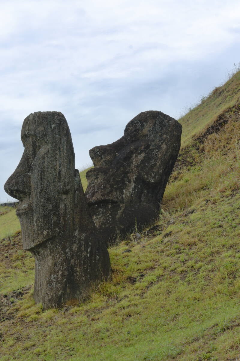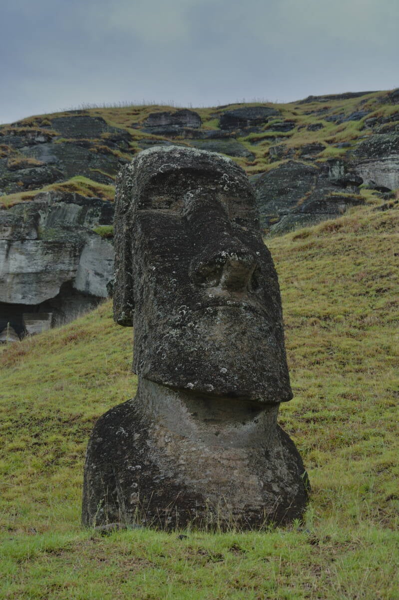 A flanc de volcan, les moai étaient entièrement réalisés sur place, taillés, et sculptés dans la carrière. Chaque détail achevé, ils étaient tirés à l’aide de cordages. La civilisation rapanui n’avait pas imaginé le principe de la roue.