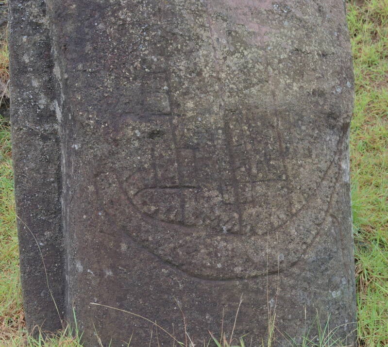 Bateau '' Européen'' en pétroglyphe sur le ventre du Moaï précédent.
