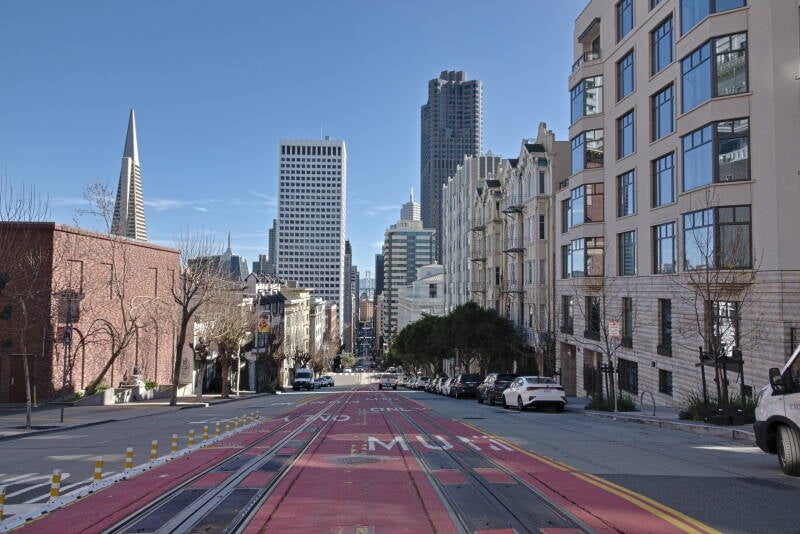 Le cable car Powell-Hyde passe en haut de la colline pour redescendre vers Fisherman’s Wharf.